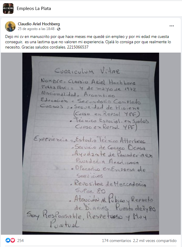 La foto del CV escrito a mano de Claudio Ariel Hochberg supera los 2 mil compartidos en Facebook. El hombre de 50 años compartió su experiencia laboral en el grupo Empleos La Plata, donde centenares de platenses se solidarizaron con su búsqueda y difundieron el caso para ayudarlo a encontrar un nuevo trabajo.