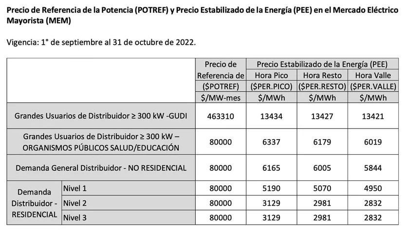 Para los usuarios del Nivel 1, el precio estabilizado de la energía (PEE) por MWh, la unidad de medida del sector, pasará en septiembre de $2.981 a $5.070, fuera de las horas pico o valle.