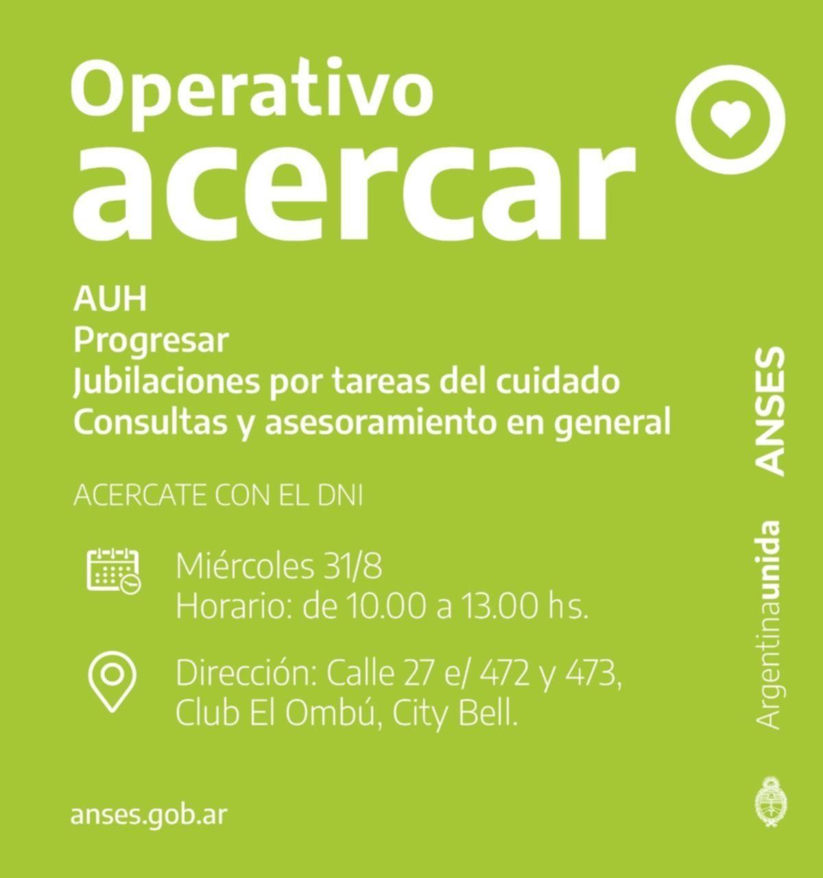 Paula Lambertini, jefa regional de la Administración Nacional de la Seguridad Social (ANSES) de La Plata, informó que este miércoles se realizará el Operativo Acercar en las instalaciones del Club El Ombú, en City Bell.