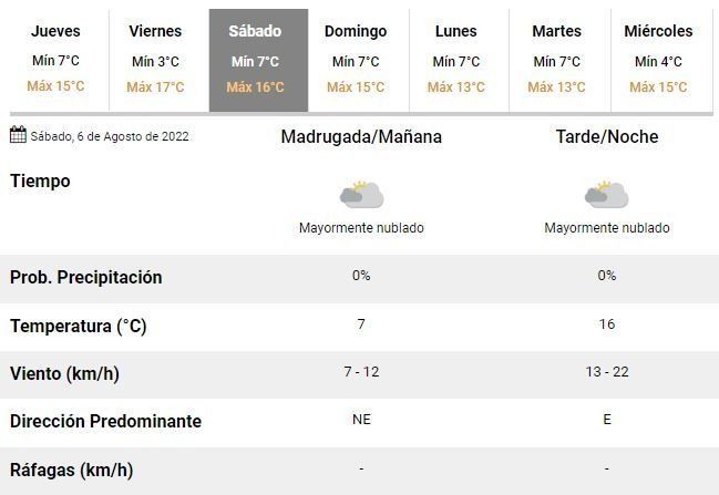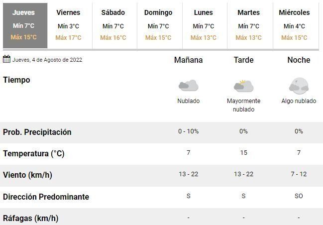 En el SMN adelantaron a su vez que para los próximos días se esperan condiciones similares. El viernes estará soleado pero bajará la temperatura, ya que se esperan 3°C de mínima durante las primeras horas del día; mientras que para los días de descanso y los primeros de la semana entrante se prevén mañanas muy frescas y tardes con máximas que rondarán los 15°C.