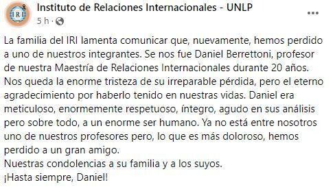 La familia del Instituto de Relaciones Internacionales de la UNLP (IRI) lo despidió a través de sus redes sociales. “Hemos perdido a uno de nuestros integrantes. Se nos fue Daniel Berrettoni, profesor de nuestra Maestría de Relaciones Internacionales durante 20 años. Nos queda la enorme tristeza de su irreparable pérdida, pero el eterno agradecimiento por haberlo tenido en nuestras vidas. Daniel era meticuloso, enormemente respetuoso, íntegro, agudo en sus análisis pero sobre todo, a un enorme ser humano. Ya no está entre nosotros uno de nuestros profesores pero, lo que es más doloroso, hemos perdido a un gran amigo”, expresaron.