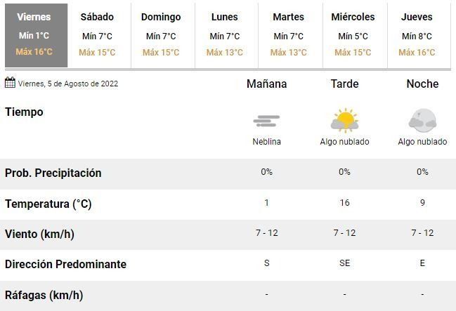 Las noticias para el inicio de la próxima semana, en tanto, no son las mejores y es que tras un fin de semana con buenas condiciones de tiempo, se espera que el clima desmejore en el transcurso del lunes y no se descarta la posibilidad de que se registren algunas lluvias y chaparrones aislados hacia el fin de esa jornada. Por lo demás, los expertos esperan varios días con mínimas de entre 5 y 8°C y máximas de hasta 16°C, nubosidad variable y vientos leves rotando del sudeste al norte.