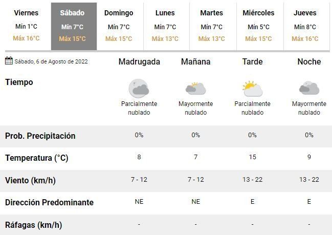 En este marco, tanto para el sábado como para el domingo próximos en el SMN pronostican un clima fresco a templado, con mínimas de 7°C y máximas que llegarían a unos 15°C durante ambas jornadas. Serán dos jornadas con un marcado aumento de la nubosidad, aunque el sol también podría dejarse ver y, afortunadamente, no se esperan lluvias.