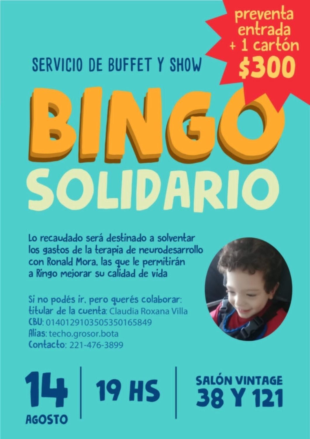 La familia también compartió el CBU de la mamá del pequeño, puesto que en él se recibien donaciones de todos los que quieran ayudarlo y no puedan asistir al bingo solidario. El CBU es 0140129103505350165849, el alias es techo.grosor.bota y el número de contacto de Claudia, si fuera necesario, es el (0221) 476-3899.