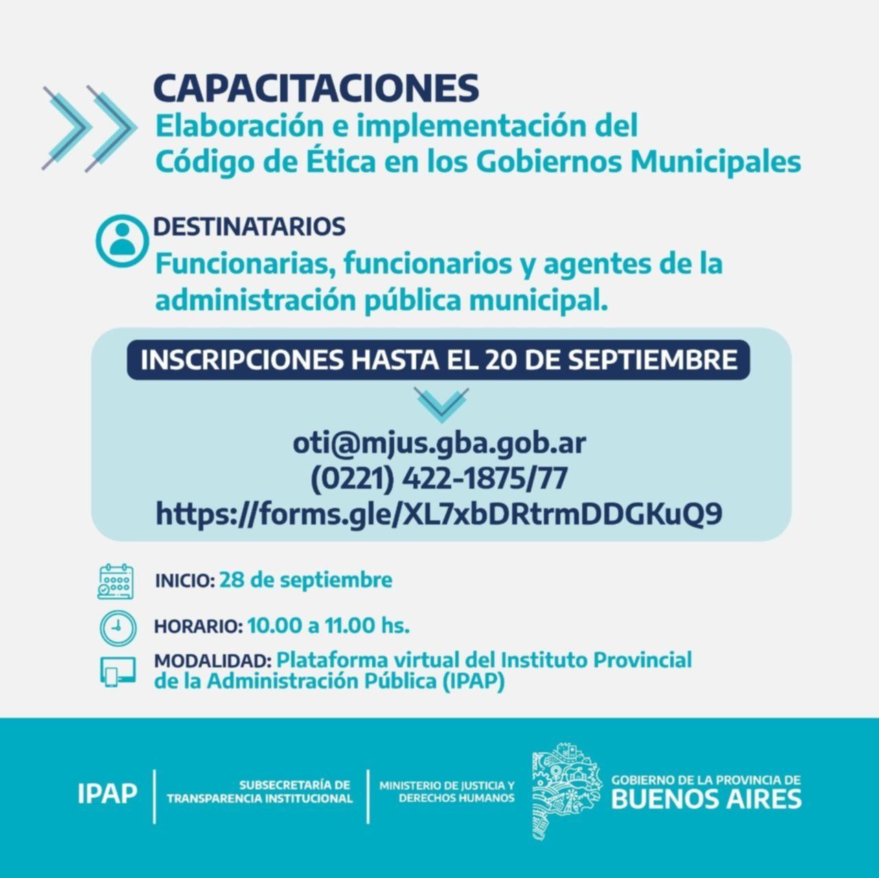 La Subsecretaría de Transparencia Institucional llevará adelante una serie de jornadas de capacitación para la "Elaboración e implementación de un Código de Ética en los gobiernos municipales", destinada a los trabajadores de los 135 municipios de la provincia. La capacitación, según se indicó, está dirigida a funcionarios, funcionarias y agentes de la administración pública municipal y fue diseñada con el propósito de brindar herramientas que les permitan a los municipios de la provincia establecer o fortalecer su sistema de promoción, impulso y garantía de la ética pública, la integridad y la transparencia hacia el interior de sus jurisdicciones en el marco del Programa Red de Oficinas de Transparencia PBA.