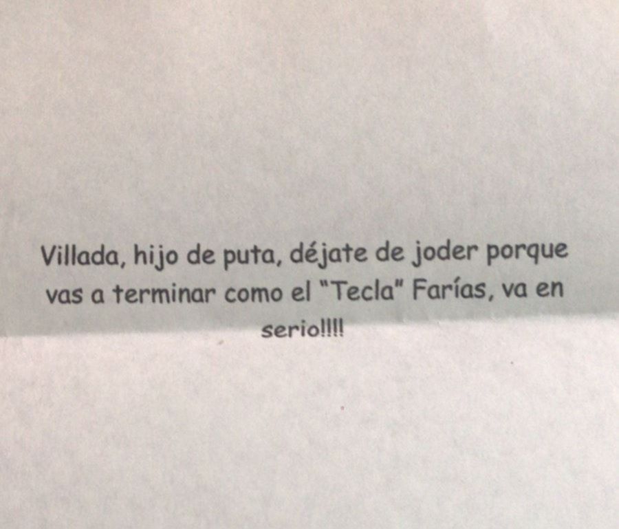 Se trata de José Luis Villada, exdefensor general del departamento judicial de San Isidro y quien en la actualidad se desempeña como abogado en la ciudad y es el defensor de Lidia Perna, la primera testigo arrepentida de la historia del departamento judicial local, cuyo testimonio fue clave contra el exmagistrado. "Villada, hijo de puta, déjate de joder porque vas a terminar como el Tecla Farías, va en serio!!!!", se lee en el escrito que la víctima encontró en el parabrisas de su vehículo, trabado con una de las escobillas de limpieza del vidrio.