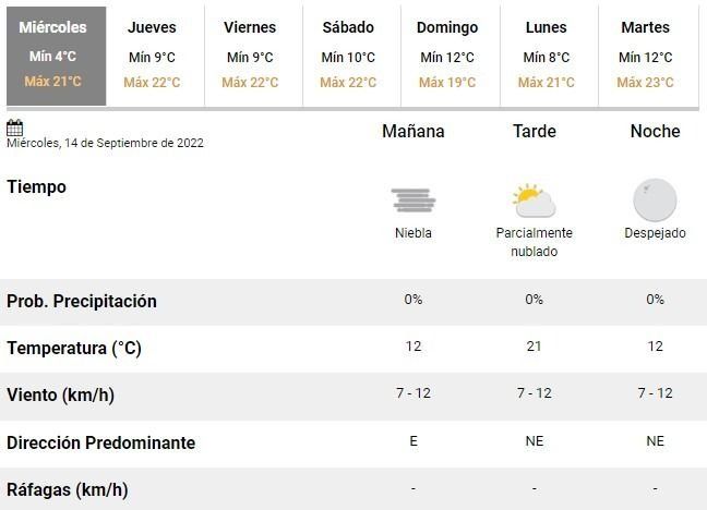 El miércoles comenzó fresco y con apenas 4°C, pero los especialistas del SMN prevén una temperatura en franco aumento y anticipan una máxima que por la tarde rondará los 21°C. En líneas generales, la jornada transcurrirá sin contratiempos, con un cielo mayormente despejado y vientos leves rotando del este al noreste.