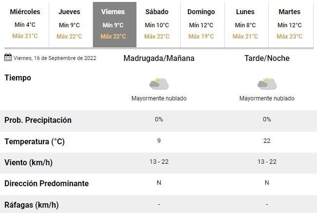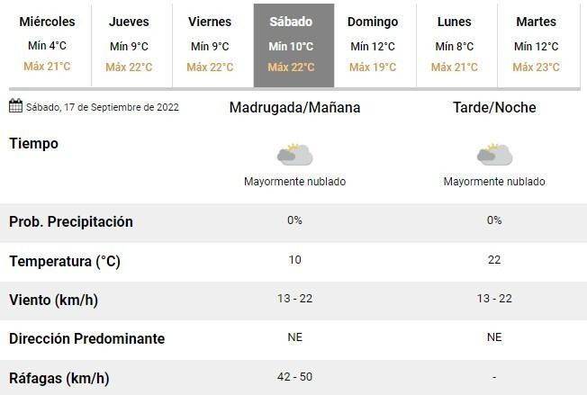 Con la misma tónica comenzaría, además, el fin de semana: para el sábado se prevé una temperatura de entre 10 y 22°C, un cielo casi completamente cubierto y mucho viento, con ráfagas incluso de entre 42 y 50 km/h.