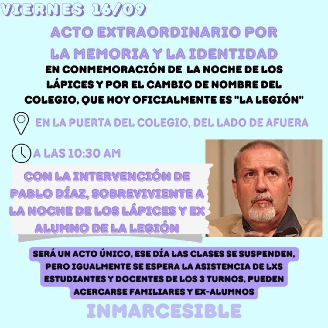 Según precisaron, el acto se realizará en la plaza Máximo Paz en conmemoración a la Noche de Los Lápices y por el cambio de nombre del colegio. Los estudiantes, preceptores, profesores, no docentes, familiares y exalumnos pueden acercarse a participar de las actividades y luego no habrá jornada escolar.