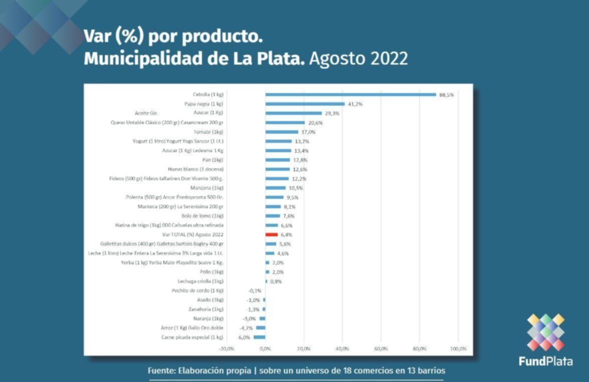 Lo llamativo del informe es que de los 26 productos que integran la canasta alimentaria platense, en algunos de ellos se registró una baja en la variación porcentual con respecto a julio. Éstos son: 1 kg de pechito de cerdo (-0,1%); 1 kg de asado (-1%); 1 kg de zanahoria (-1,3%); naranja (-3%); 1 kg Arroz Gallo Oro Doble (-4,7%); y 1 kg carne picada especial (-6%).