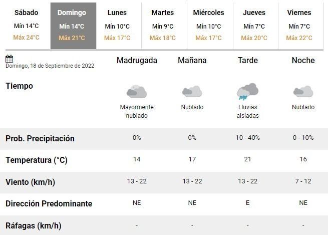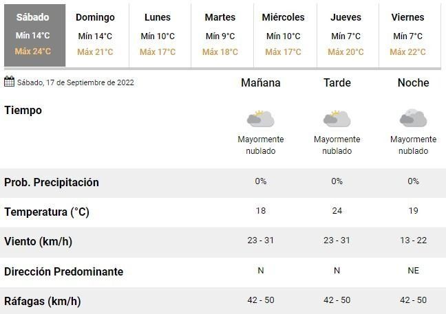 Para este sábado, la temperatura máxima estimada es de 24°C, con el sol apenas asomando y una humedad del 77%. El viento, por su parte, soplará del norte a 14 km/h y los expertos advierten además que podrían registrarse fuertes ráfagas de viento de en la región, alcanzando velocidades de hasta 50 km/h.