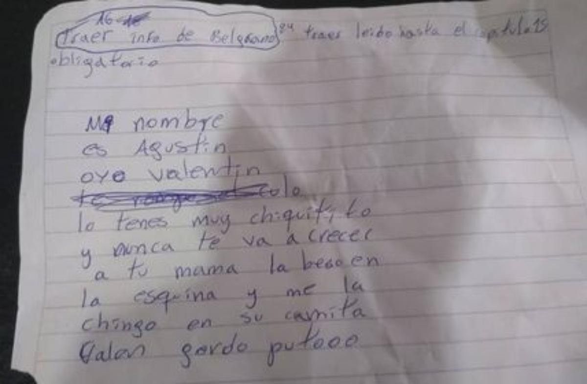 Además, contó que el nene recibe amenazas, agresiones verbales, burlas y hasta llega a su casa con notas adentro de su mochila en donde lo denigran constantemente por su aspecto físico.