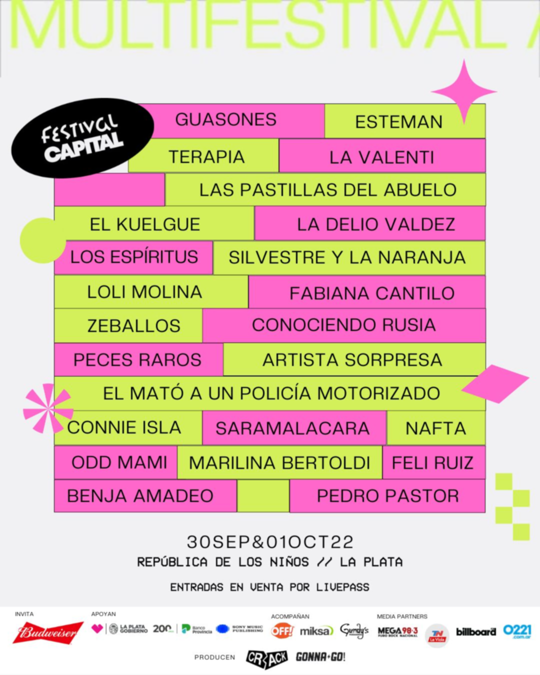 Guasones - Las Pastillas del Abuelo - La Delio Valdez - Loli Molina – El Mató a un Policía Motorizado - Fabiana Cantilo - Silvestre y la Naranja - La Delio Valdéz - Los Espíritus - Esteman - Terapia - La Valenti - Gauchito Club - Sucre - El Chacal & los Alpes Floreados - BB Asul - Juli Suanno - Vale Acevedo