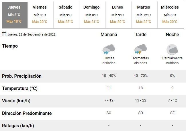 Los expertos anticipan lluvias aisladas en las últimas horas de la mañana y tormentas de variada intensidad para la tarde. El mal tiempo estaría acompañado, además, de bajas temperaturas y es que el día comenzó con apenas 8°C y la máxima llegaría solo a unos 18°C, siempre con el cielo completamente cubierto.
