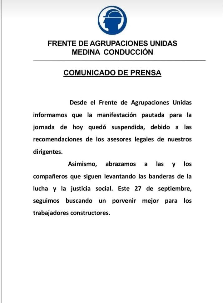 La convocatoria había sido realizada desde el "Frente de Agrupaciones Unidas", la herramienta política sindical del medinismo con la que buscan recuperar la conducción del gremio en caso de ser absueltos en el juicio oral que se postergó. Sin embargo, a primera hora de este martes un comunicado anunció que se cancelaba la movilización.