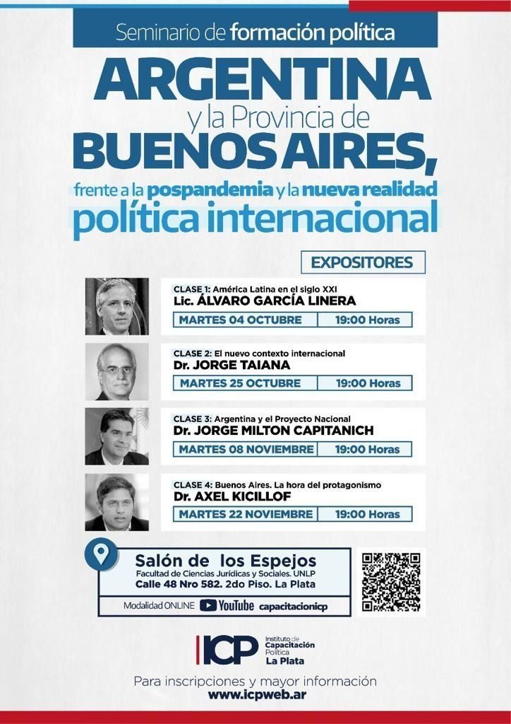 El Instituto de Capacitación Política y Estudios Estratégicos de La Plata (ICP) lanzó un ciclo de conferencias que tendrá como expositores al ex vicepresidente de Bolivia Álvaro García Linera, al ministro de Defensa de la Nación Jorge Taiana y a los gobernadores Jorge Capitanich y Axel Kicillof. La clase inaugural será el 4 de octubre a las 19, en el Salón de los Espejos de la Facultad de Ciencias Jurídicas y Sociales de la UNLP.