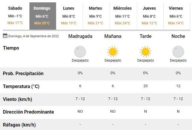 Sin nubes y con el viento soplando desde el norte, para el domingo los meteorólogos prevén una temperatura oscilando entre los 6 y 20°C en toda la región. Será la antesala de una semana que comenzará con varios días de clima primaveral pero a la espera de nuevas lluvias.