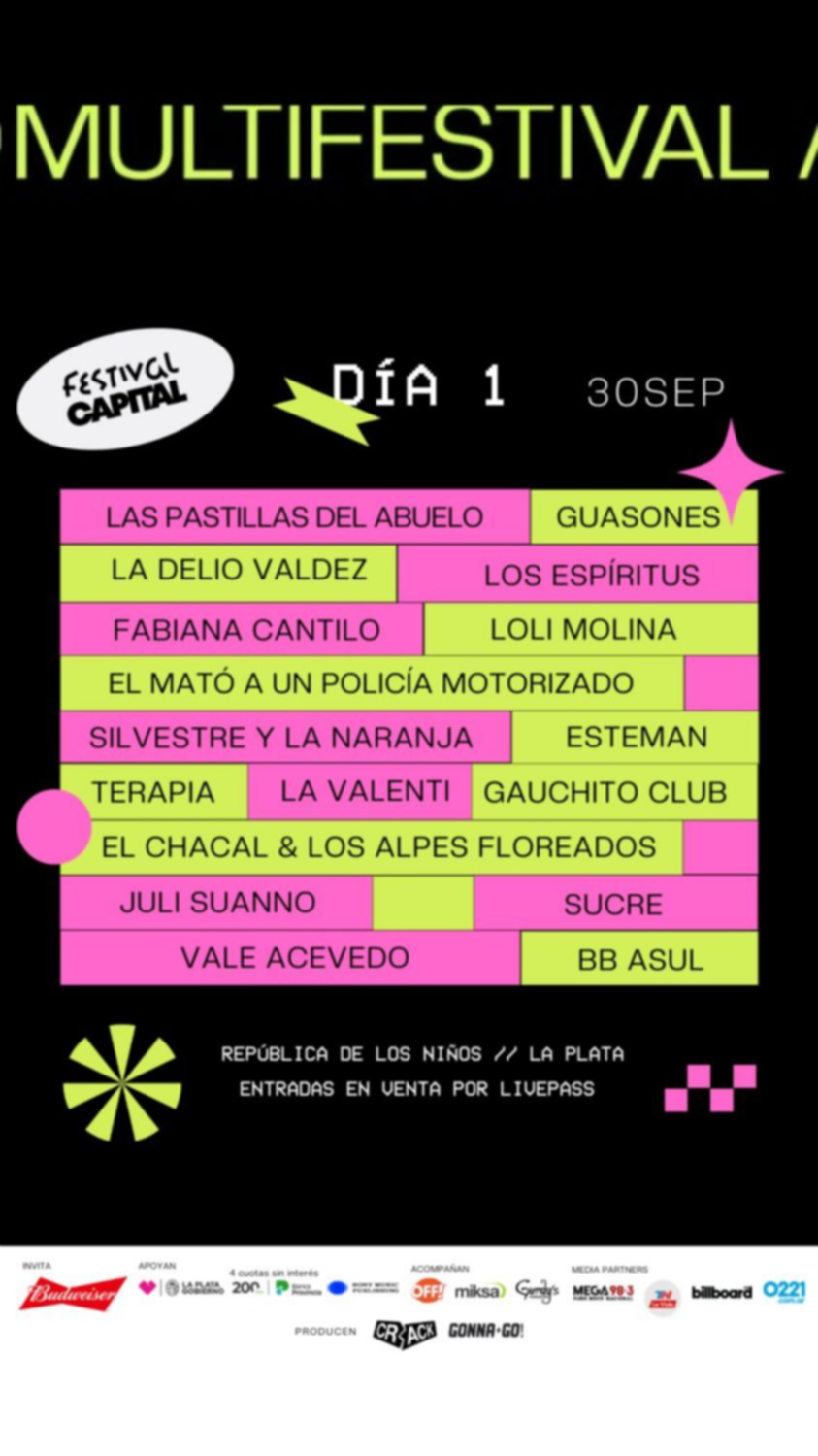 Más tarde, los locales Guasones calentarán aún más el panorama, cuando el cielo ya esté oscuro pero el destello de sus "potentes rocanroles" baste para encender la noche. Le seguirá el ameno ambiente que proponen Los Espíritus; el baile irrefrenable que desencadena La Delio Valdez con su música tropical; los himnos del indie platense de Él Mató a un Policía Motorizado; y, para terminar un día cargado de emociones, un cierre con Las Pastillas del Abuelo, que invitará al baile y al pogo, aunque conviene no cansarse demasiado, porque resta otra jornada prometedora.
