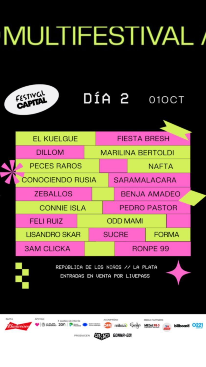 Más tarde, el clima se pondrá más rockero con Conociendo Rusia y groovero con Nafta, que luego dará paso a Marilina Bertoldi, quien promete un show contundente, fiel a su estilo vanguardista y rompedor. Para continuar en esa línea, Dillom, uno de los artistas favoritos y más esperados por el público joven, continuará rompiendo esquemas con las contundentes canciones de su disco Post Mortem.