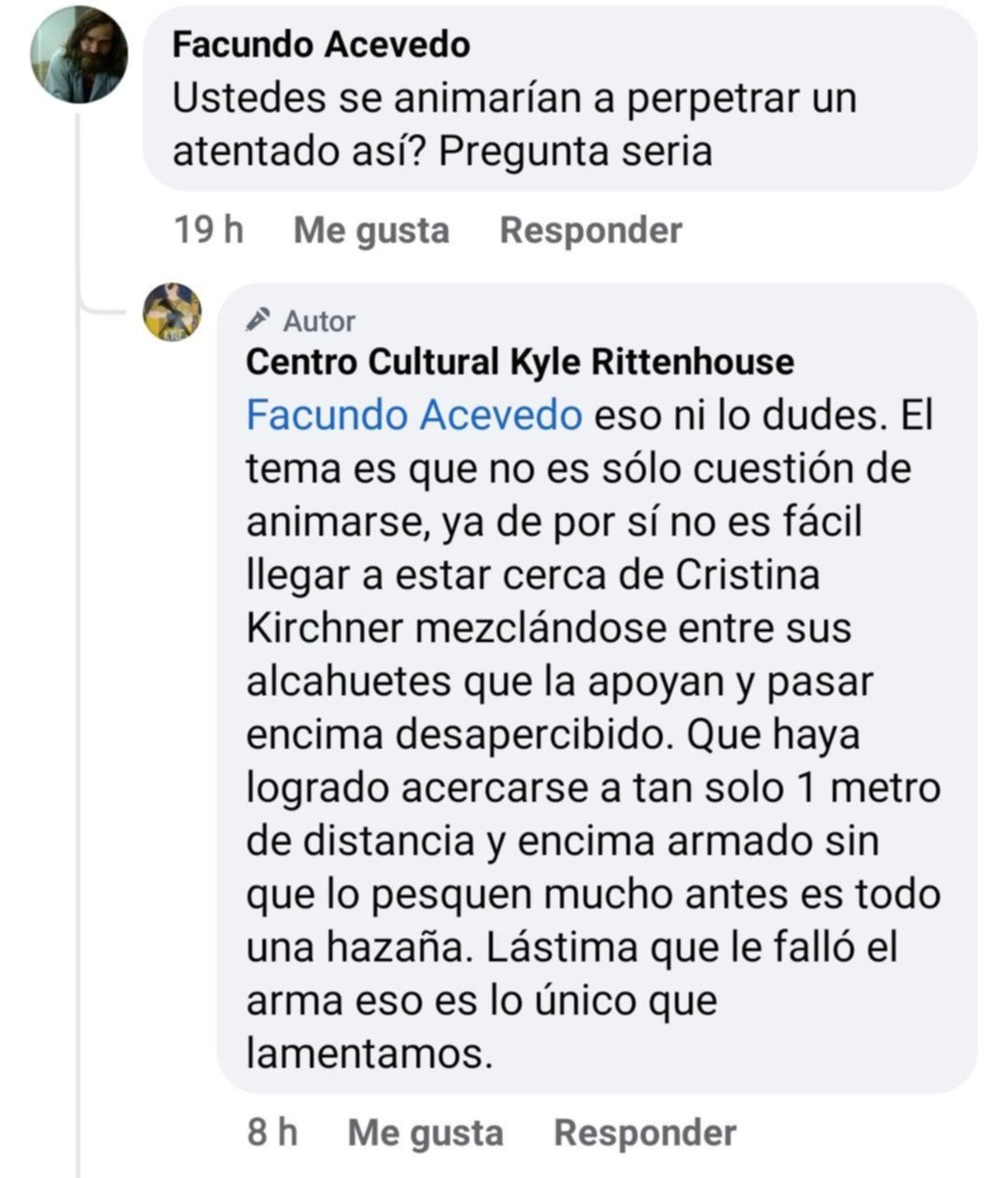 "¿Ustedes se animarían a perpetrar un atentado así? Pregunta seria", comentó en una publicación el usuario Facundo Acevedo, que rápidamente recibió una respuesta del espacio Rittenhouse con el siguiente mensaje: "Eso ni lo dudes. El tema es que no es solo cuestión de animarse. Ya de por sí, no es fácil llegar a estar cerca de Cristina Kirchner, mezclándose entre sus alcahuetes que la apoyan y así pasar por encima desapercibido. Que haya logrado acercarse a tan solo 1 metro de distancia y encima armado sin que lo pesquen mucho antes es todo una hazaña. Lástima que le falló el arma, eso es lo único que lamentamos", sentenciaron con total crudeza.