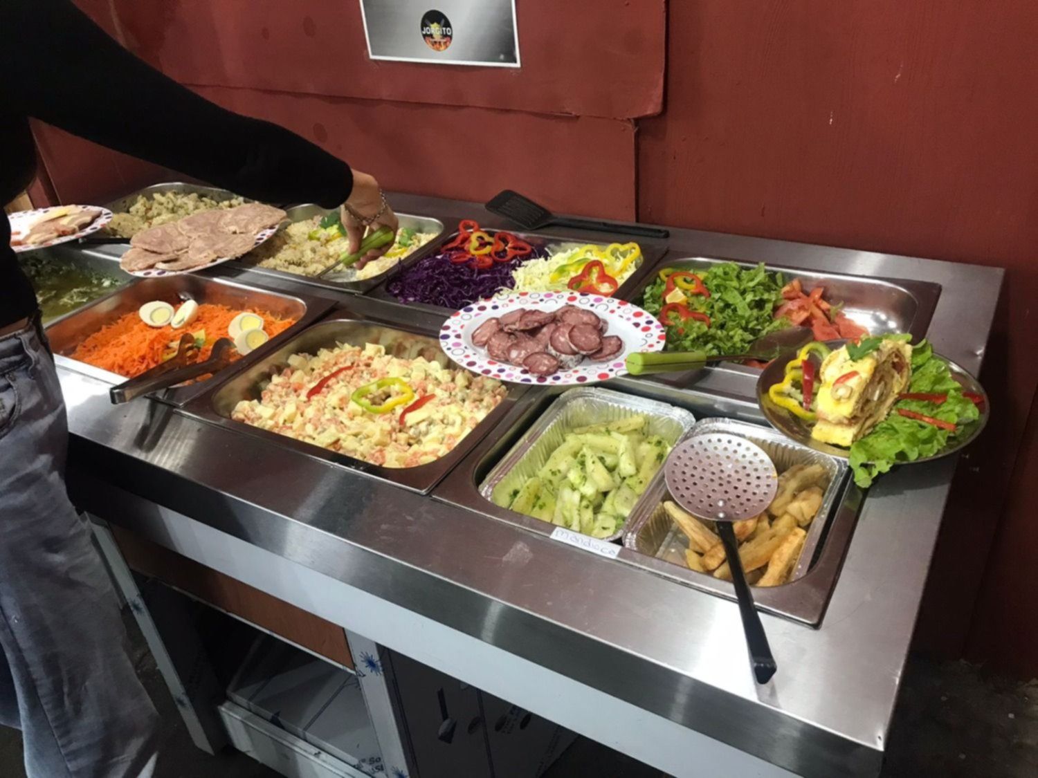 El servicio funciona de viernes a domingo entre las 20 y las 23, de noche, y los sábados y los domingos también al mediodía, entre las 12 y las 15. "Miren lo que es esto", muestra Jorgito con su característico ritmo frenético, orgulloso de una presentación prolija y colorida en la que sobresalen las distintas variedades de ensaladas, los fiambres y los platos fríos y calientes que se renuevan todo el tiempo: papas fritas, milanesas a la napolitana, filetes de merluza, canelones con salsa, mondongo y albóndigas, entre otros. A estos, por supuesto, se suma la parrilla: "Pueden servirse la cantidad de veces que quieran, y pueden ir a la parrilla también todas las veces que tengan ganas", les aclara Jorgito a los clientes, con alegría.
