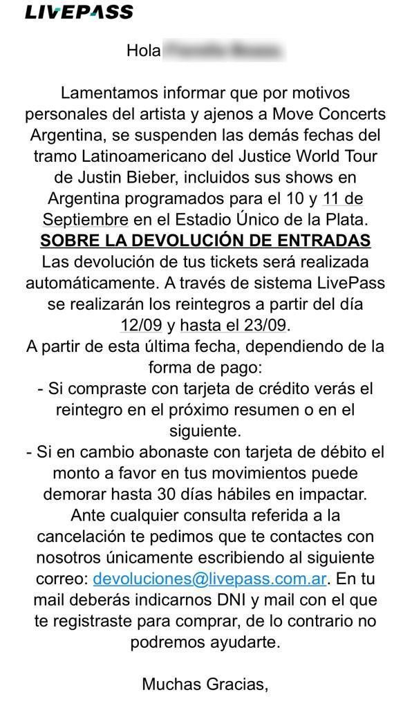 “Lamentamos informar que por motivos personales del artista y ajenos a Move Concerts Argentina, se suspenden las demás fechas del tramo Latinoamericano del Justice World Tour de Justin Bieber, incluidos sus shows en Argentina programados el 10 y 11 de septiembre en el Estadio Único de La Plata”, comienza el mail que recibieron quienes tenían ticket para asistir a una de las presentaciones del artista canadiense.