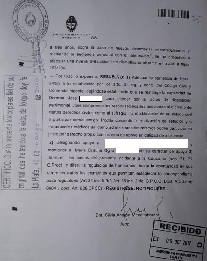 El 26 de septiembre de 2017, la jueza Silvia Andrea Mendilaharzo, del fuero de Familia de La Plata, dictaminó que Derman tiene sus capacidades restringidas, en el marco de artículo 31 del Código Civil y Comercial de la Nación que establece: