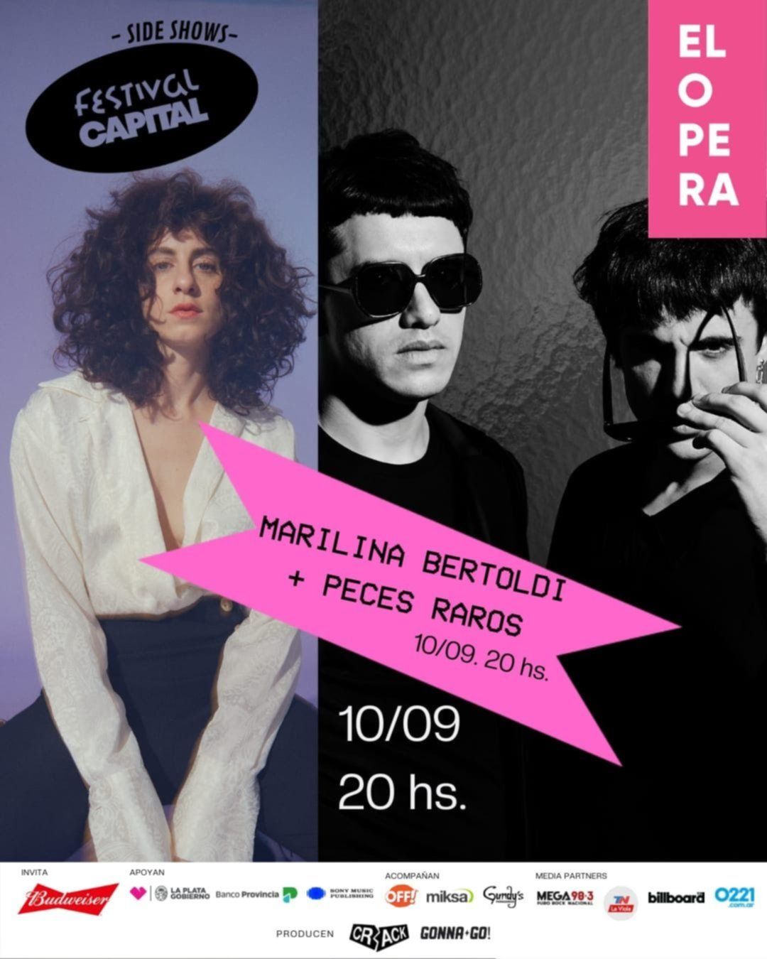 Comienzan los side shows del Festival Capital, por primera vez juntos y en el emblemático Teatro Opera La Plata "Marilina Bertoldi" y "Peces Raros" se adueñaran del escenario. Y atención porque el show cuenta con un beneficio exclusivo para quienes ya tengan su abono: podrán ingresar sin cargo hasta las 20.30 presentándolo en la puerta. A las 20 en el Teatro Opera.