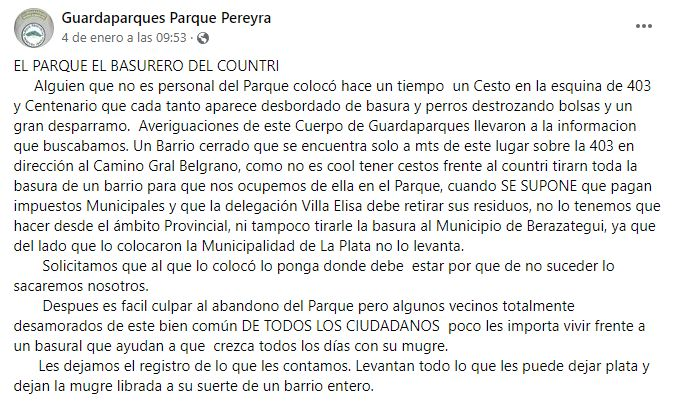 "El parque, basurero del country", comenzaba el texto que la comunidad de guardaparques del Parque Pereyra difundió en su página de Facebook para denunciar que alguien "que no es personal del Parque" colocó un cesto en la esquina de 403 y Centenario y "cada tanto aparece desbordado de basura, con perros destrozando bolsas y (generando) un gran desparramo".