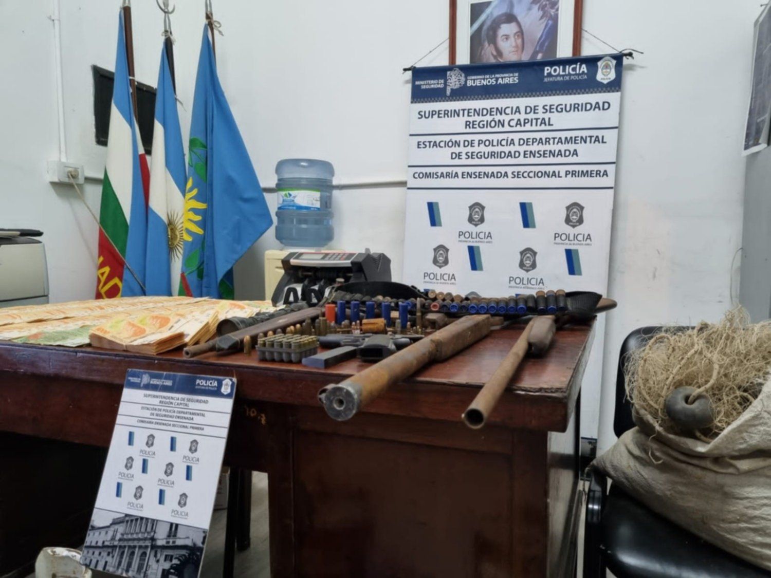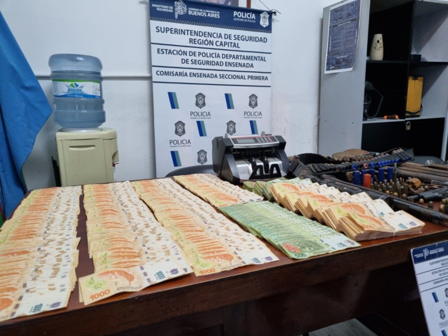 Fue entonces que el hombre, de 42 años, decidió denunciar el robo y los agentes de la comisaría Primera de Ensenada arribaron a la casa donde hallaron e incautaron una Pistola 45 con cargador con 6 municiones colocadas y sin declarar, 35 cartuchos de escopeta 12/70, una carabina 22 con proyectil percutado sin declarar, 40 municiones de diversos calibres, cuatro garrafas, un trasmayos de pesca, una máquina de contar dinero y la suma de 1.373.000 pesos que serían parte de la transacción.