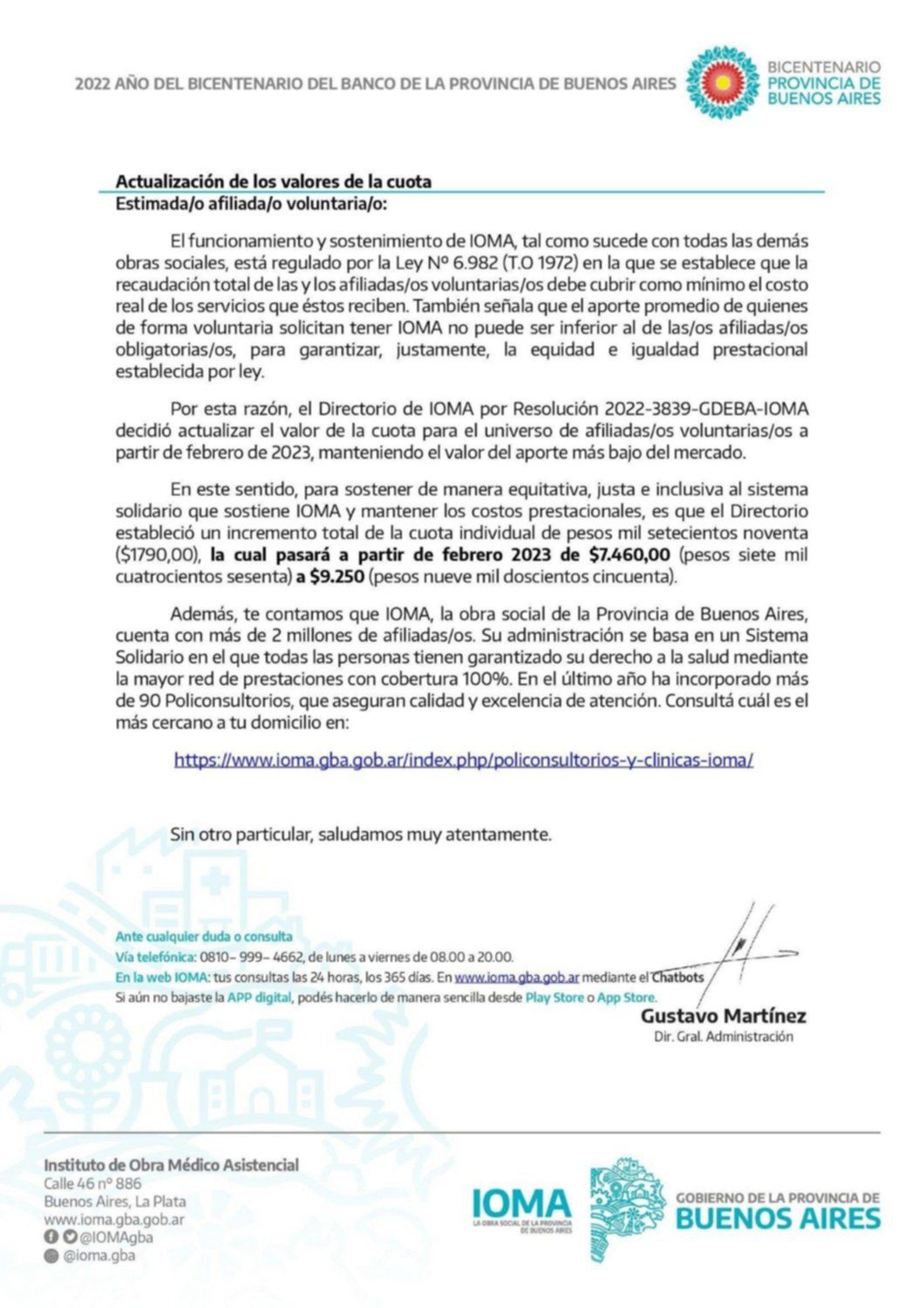 "Te contamos que IOMA, la obra social de la Provincia de Buenos Aires, cuenta con más de 2 millones de afiliadas/os. Su administración se basa en un Sistema Solidario en el que todas las personas tienen garantizado su derecho a la salud mediante la mayor red de prestaciones con cobertura 100%. En el último año ha incorporado más de 90 Policonsultorios, que aseguran calidad y excelencia de atención", recuerdan en la misiva, firmada por el director General de Administración Gustavo Martínez.