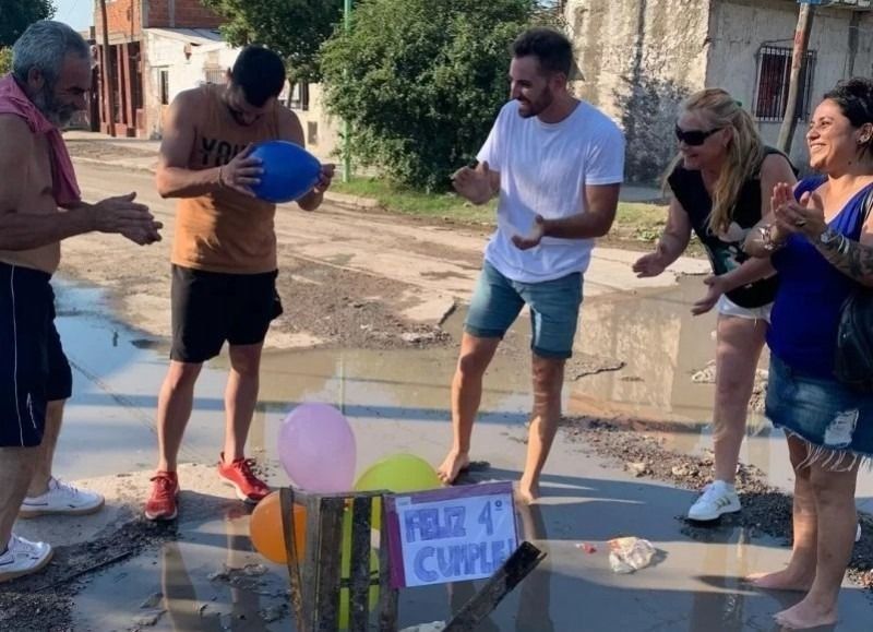 Con globos y carteles de colores, los vecinos salieron a la calle y, alrededor de un bache lleno de agua, le cantaron el feliz cumpleaños. Todo fue registrado en fotos que no tardaron en viralizarse en redes.