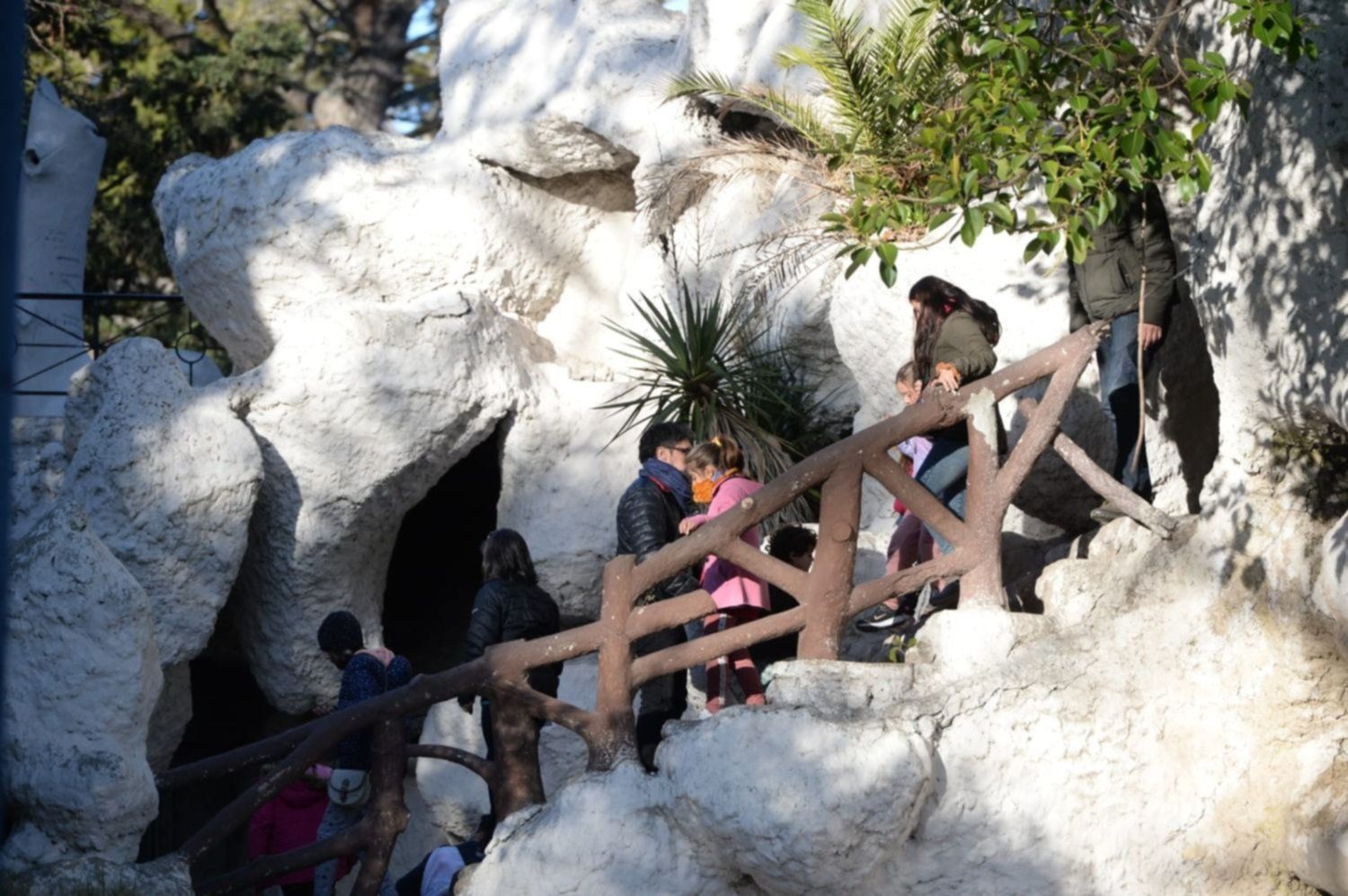 Construida a fines de siglo, la gruta es un lugar donde por décadas los chicos de todas las generaciones juegan a esconderse, trepar y gritar con el eco. Es una especie de laberinto artificial que posee tres marcados niveles para la cascada y los miradores. Desde la más alta se tiene la mejor perspectiva para ver el lago en todo su esplendor y varios edificios de la ciudad.