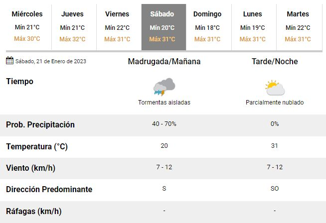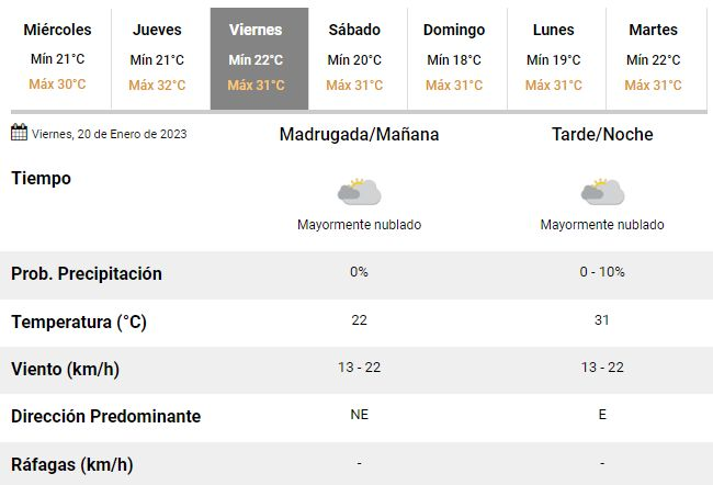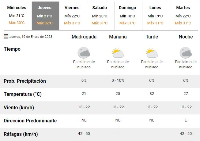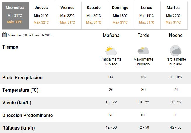 En este marco, para este miércoles se espera una temperatura máxima en torno a los 30°C, con cielo de parcial a mayormente nublado, una humedad del 78% y vientos del noreste a una velocidad de entre 13 y 22 km/h, aunque también se anticipan fuertes ráfagas que podrían alcanzar velocidades de 42 a 50 km/h.
