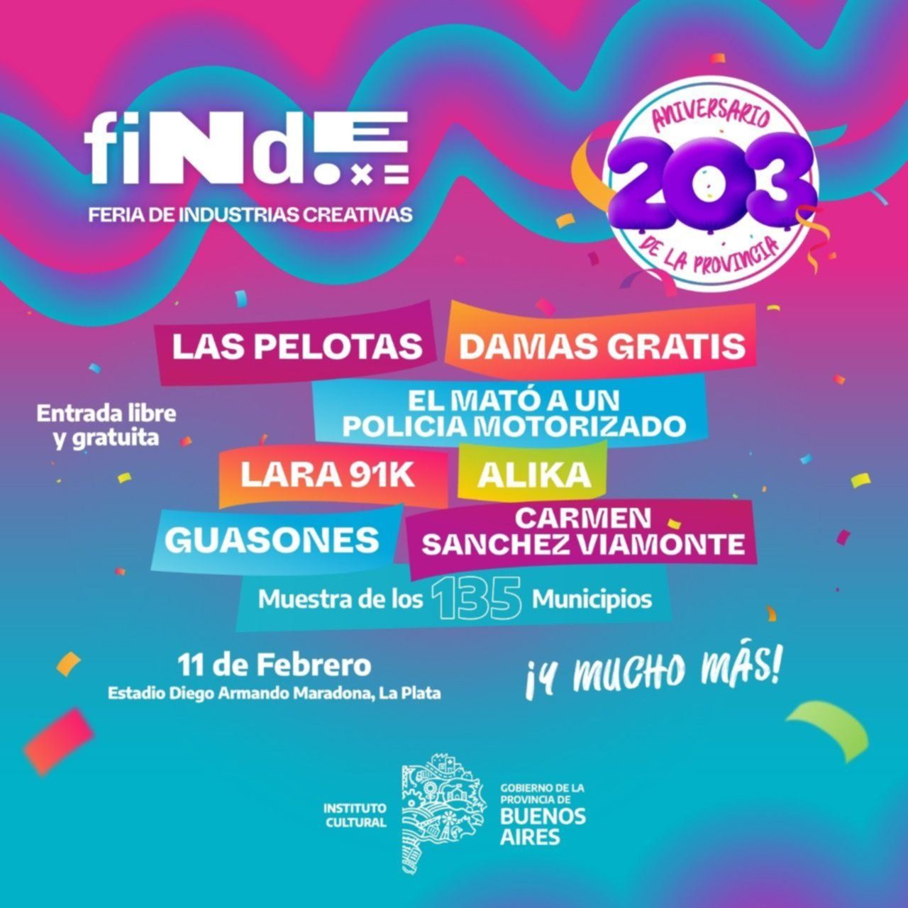 La Provincia festejará sus 203 años en La Plata con una nueva edición de la Feria de las Industrias Creativas (FINDE) en el Estadio Único Diego Armando Maradona. El evento se realizará el próximo 11 de febrero y contará con la presencia de grandes grupos musicales, como Guasones, Damas Gratis, Las Pelotas y Él Mató a un Policía Motorizado.