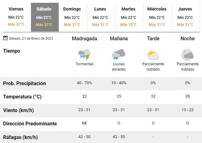 Las tormentas finalmente llegarían avanzando desde el sureste y no solo traerían consigo mucha agua sino fuertes vientos, con ráfagas de entre 51 y 59 km/h por la tarde y 42 y 50 km/h durante las últimas horas del día. De acuerdo con el pronóstico del SMN, la misma tónica se repetirá además durante la madrugada del sábado, para cuando se espera una temperatura mínima de 22°C, vientos de hasta 50 km/h y las tormentas más intensas del temporal que llega a la ciudad.