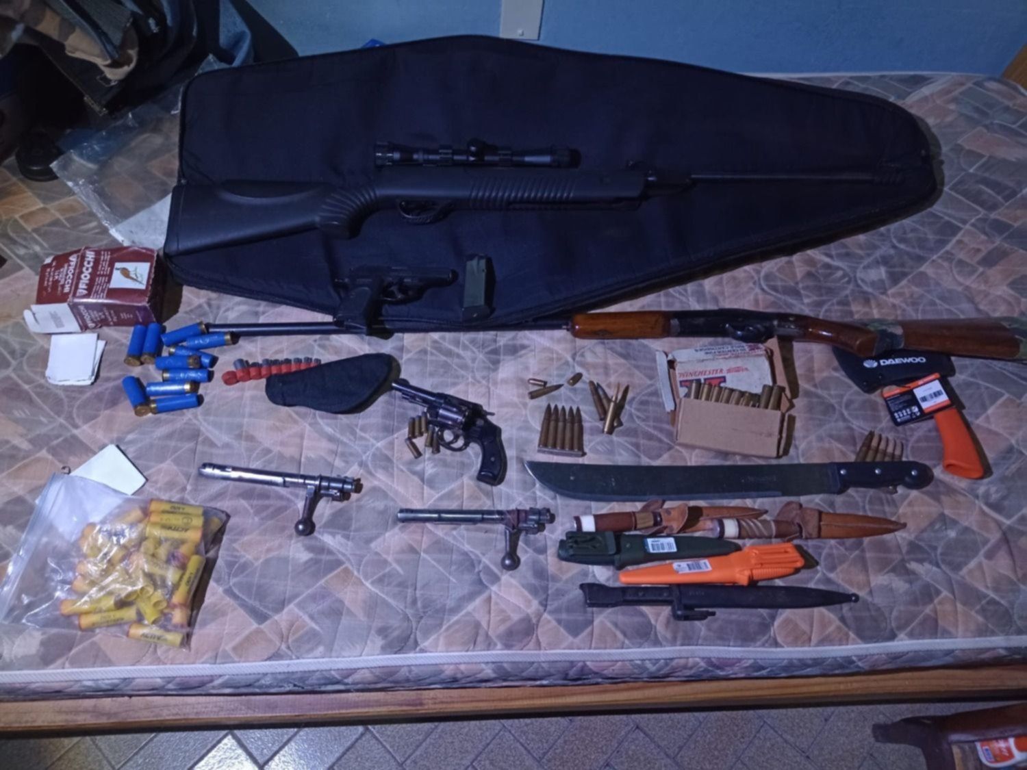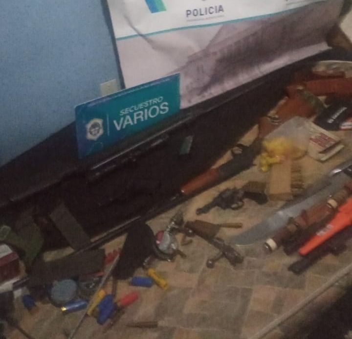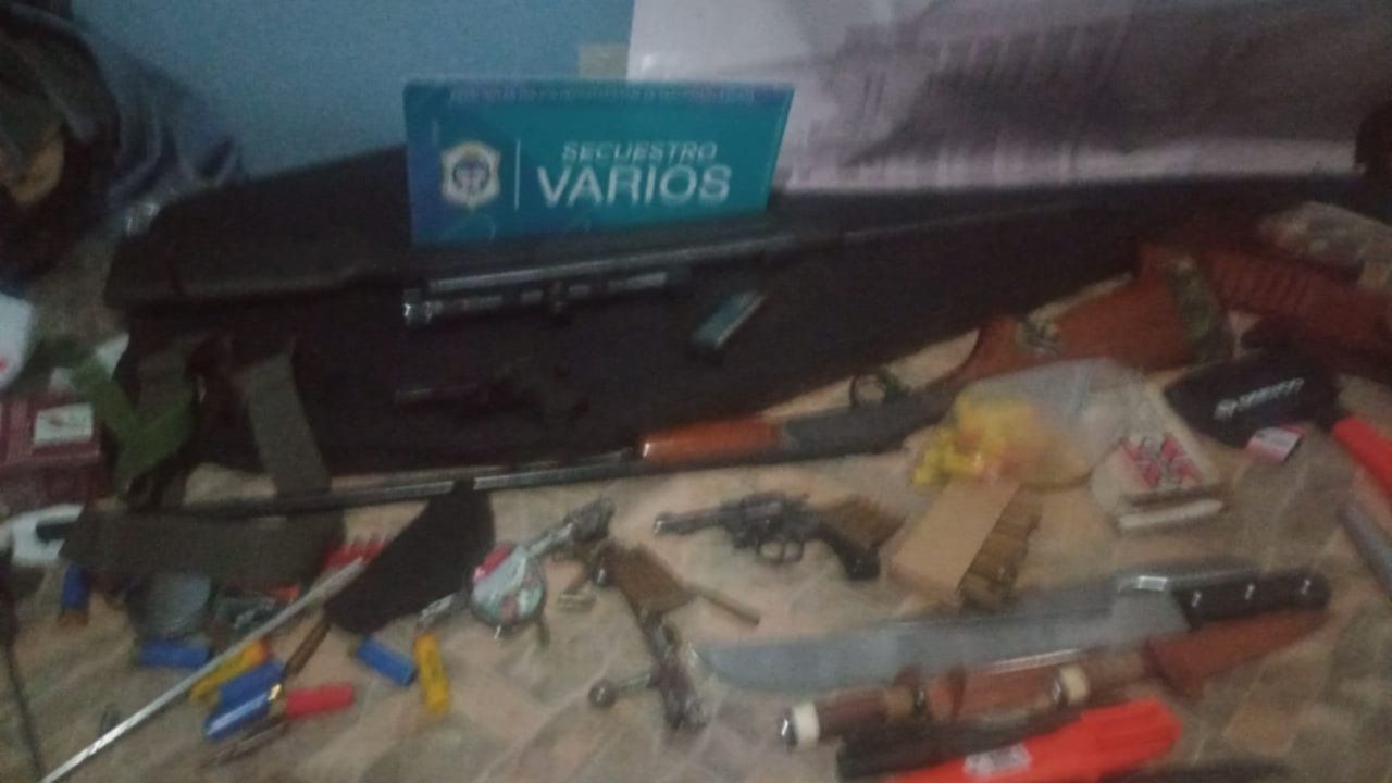 Durante el operativo, los agentes advirtieron que el propietario tenía dentro de un mueblo un arsenal de armas de fuego y municiones. Los investigadores detallaron que en las tareas secuestraron: un rifle 5 1/2 con mira telescópica marca Hastan; una escopeta marca Centauro; pistola Bersa 380 con cargador; revolver cal.22 con tambor completo; dos cerrojos de escopeta Mouser; un cargador de pistola cal.9mm marca Bersa; doce proyectiles calibre .32; dos proyectiles 380; catorce proyectiles 308; 17 proyectiles de subfusil; diez cartuchos de escopeta 16; 28 cartuchos de escopeta 20; un machete marca versa; cinco cuchillos; y un hacha de mano.