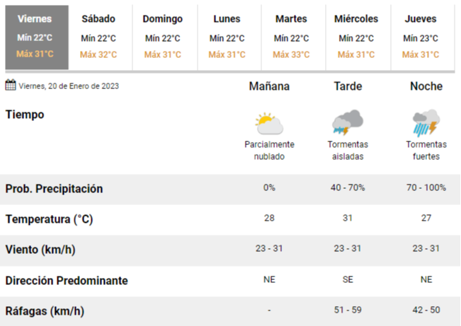 Así las cosas, los meteorólogos argentinos pronostican un viernes con un cielo parcialmente nublado, con una máxima de hasta 31%, gran humedad y vientos moderados de entre 23 y 31 km/, pudiendo registrarse fuertes ráfagas de hasta 59 km/h.