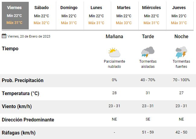 Las tormentas finalmente llegarían avanzando desde el sureste y no solo traerían consigo mucha agua sino fuertes vientos, con ráfagas de entre 51 y 59 km/h por la tarde y 42 y 50 km/h durante las últimas horas del día. De acuerdo con el pronóstico del SMN, la misma tónica se repetirá además durante la madrugada del sábado, para cuando se espera una temperatura mínima de 22°C, vientos de hasta 50 km/h y las tormentas más intensas del temporal que llega a la ciudad.