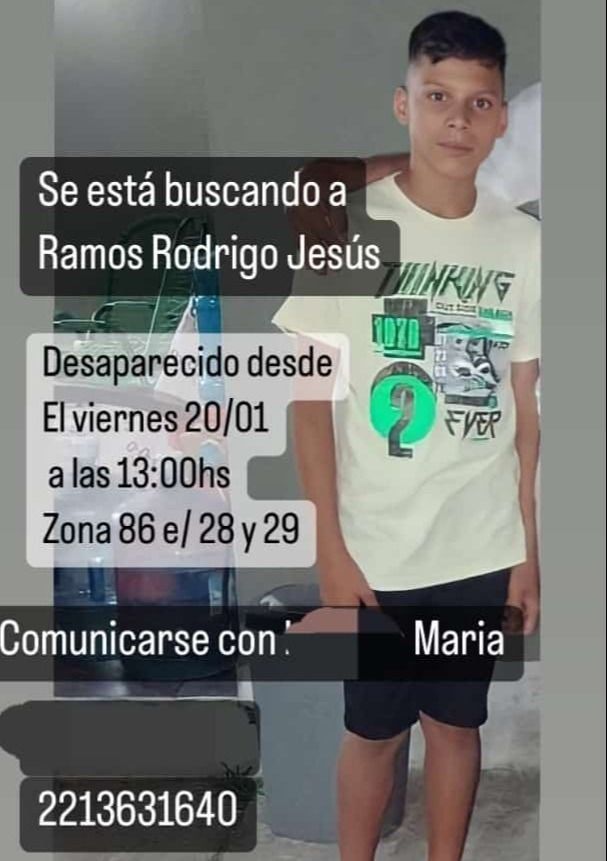 Se renueva el pedido de ayuda por parte de la familia de Rodrigo Jesús Ramos, el chico de 13 años que desapareció en el barrio de Altos de San Lorenzo este último viernes cuando se iba "a jugar a la Play" a la casa de un amigo, aunque los padres de su compañero nunca lo vieron llegar.