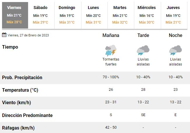 Las mismas condiciones climáticas, además, se repetirían durante la madrugada del sábado y hasta pasado el mediodía, con otra intensa descarga de agua alrededor de las 17 de esa jornada. El domingo, por su parte, finalmente volvería el buen clima a la región, con algunas pocas nubes en el cielo, sol y temperaturas en franco aumento, con un pico de hasta 31°C en la ciudad.