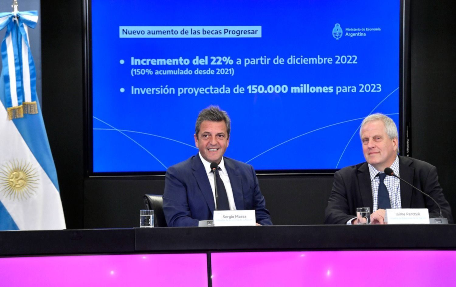 El ministro de Economía, Sergio Massa, y su par de Educación, Jaime Perczyk, anunciaron esta tarde un aumento del 22% en el monto del programa de becas Progresar que reciben casi 1,7 millones de alumnos secundarios y universitarios de todo el país.
