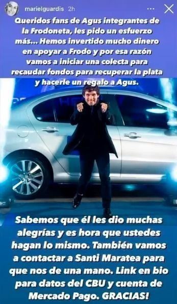 "Queridos fans de Agus integrantes de la Frodoneta, les pido un esfuerzo más. Hemos invertido mucho dinero en apoyar a Frodo y por esa razón vamos a iniciar una colecta para recaudar fondos para recuperar la plata y hacerle un regalo a Agus", decía el supuesto mensaje escrito por Mariel Guardis, mamá del participante del reality, en una de sus stories de Instagram que corrió como reguero de pólvora entre los fanáticos del programa y despertó una andanada de críticas.