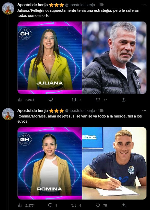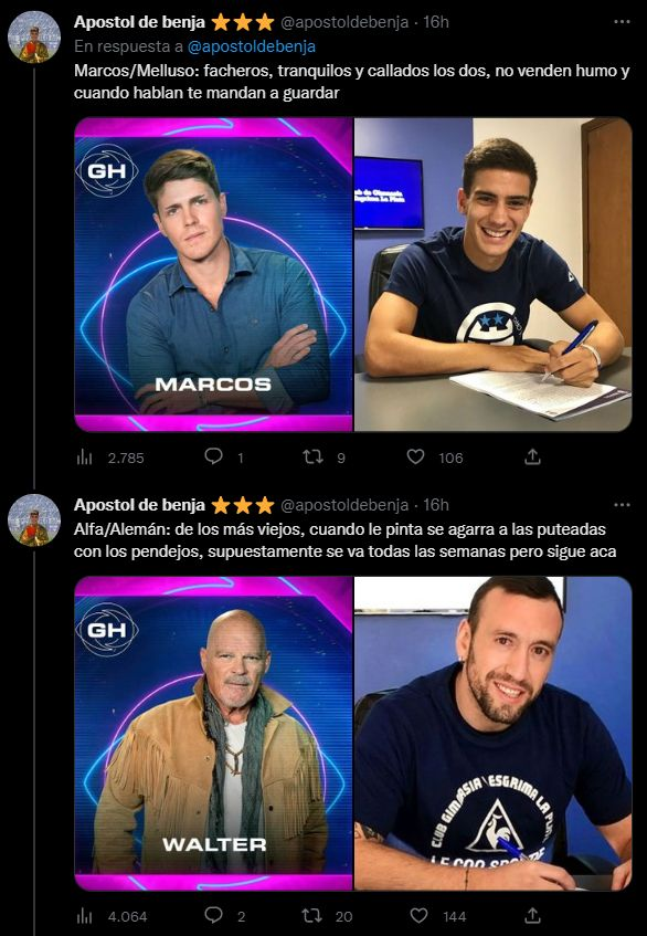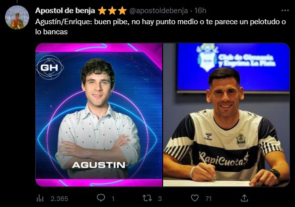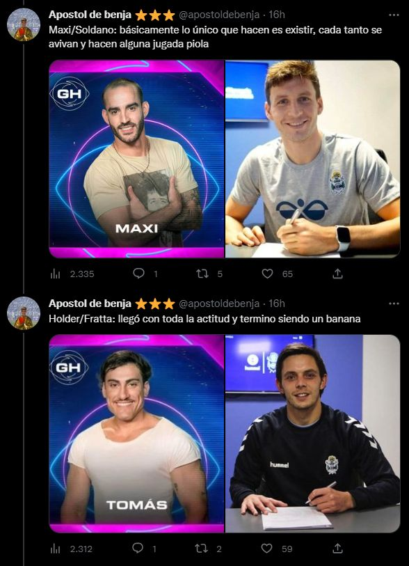 Fue la cuenta @apostoldebenja –por el joven Benjamín Domínguez– que se las ingenió para buscar coincidencias entre diferentes jugadores del club de sus amores y los integrantes de la casa de Gran Hermano. El hilo con una extensa lista de tuits desató una catarata de reacciones y mensajes que celebraron el posteo. "Hilos así es lo que necesita gimnasia para salir de la crisis, banco", escribió, irónicamente y entre risas, un hincha del Lobo.