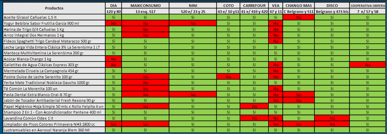 Los que mayor nivel de cumplimiento registraron fueron Coto (de 43 entre 10 y 11) y la Cooperativa Obrera (7 entre 57 y 58), lo cuales tienen 19 de los 20 productos que fueron relevados y están incluidos en en programa. Los siguen Nini (520 y 25), Carrefour (41 entre 419 y 420) y Disco (Belgrano y 473 bis) con stock en 18 de los 20 productos.