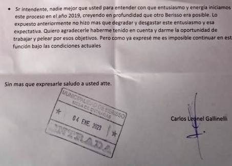 "Señor Intendente, nadie mejor que usted para entender con qué entusiasmo y energía iniciamos este proceso en el 2019, creyendo en profundidad que otro Berisso era posible. Lo expuesto anteriormente no hizo más que degradar y desgastar este entusiasmo y esa expectativa”, aseguró Gallinelli en el último párrafo de su renuncia, al tiempo que agradeció haber sido convocado en su momento para el cargo pero remarcando que le resulta "imposible continuar en esta función bajo estas condiciones".