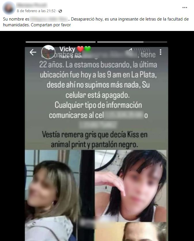M.A.R. fue hallada sana y salva tras casi 2 días de búsqueda en La Plata el sur del conurbano bonaerense, dado que es estudiante de la Universidad Nacional de La Plata pero vive en la ciudad de Berazategui.