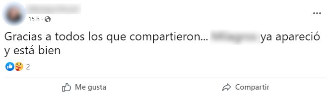 Sus familiares y allegados agradecieron a todos los vecinos que, alarmados, ayudaron en la búsqueda y finalmente permitieron que M.A.R. pudiera reencontrarse con sus seres queridos.