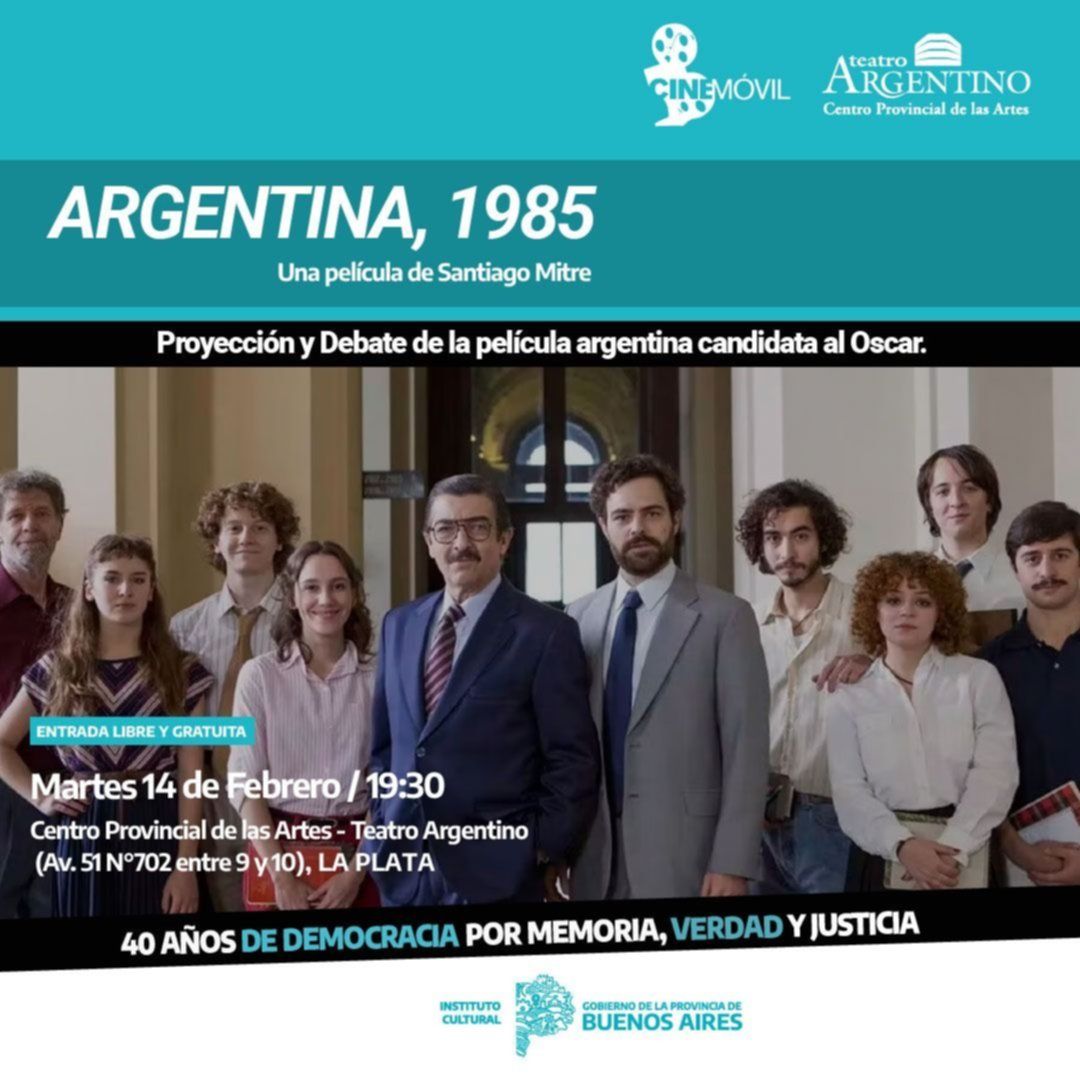 A través del ciclo Cinemóvil, el Instituto Cultural de la provincia de Buenos Aires y el Instituto Nacional de Cine y Artes Audiovisuales (INCAA) proyectarán la película nominada al Oscar "Argentina, 1985" en el Centro Provincial de las Artes Teatro Argentino de La Plata, ubicado 51 entre 9 y 10. Será este martes desde las 19.30, con entrada libre y gratuita y una vez finalizado el largometraje se llevará cabo una instancia de charla y debate con los asistentes.