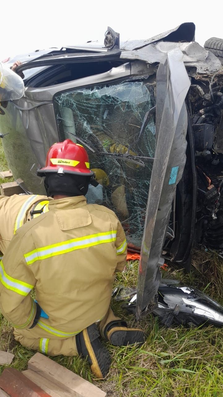 Fue un llamado al 911 el que alertó a los efectivos del Destacamento Vial Coronel Vidal de lo ocurrido, por lo que rápidamente se trasladaron hasta el lugar. Al llegar, se encontraron con un Nissan Versa tumbado sobre el lado derecho y cuatro personas heridas.